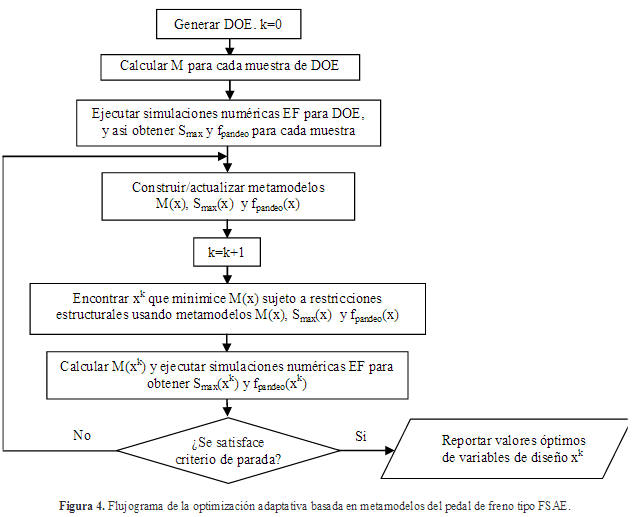 Este trabajo presenta una estrategia efectiva basada en metamodelos para minimizar la masa de un pedal de freno tipo FSAE (M) sujeto a restricciones estructurales, i.e. , de esfuerzo - S max (relacionado con el esfuerzo de von Mises) y de pandeof pandeo . La efectividad de la estrategia propuesta es el resultado del uso de metamodelos (Kriging y regresión polinomial) para las funciones M, S max y f pandeo , y un enfoque de optimización adaptativa (actualización del metamodelo) basado en gradientes.