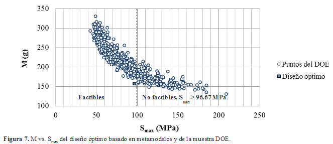Los valores de M, Smax y fpandeo asociados a cada una de la muestras del DOE fueron determinados usando análisis de propiedades de masa, y simulaciones numéricas basada en elementos finitos ( Smax y fpandeo ) con estudios estático lineal y pandeo no lineal disponibles en el programa ANSYS Workbench®, respectivamente.