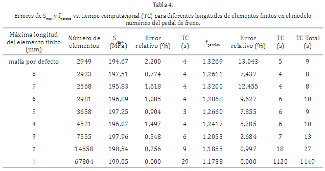 La Tabla 4 muestra los resultados del estudio de la resolución de la malla para nueve (9) longitudes máximas de elementos finitos del modelo numérico del pedal de freno reseñado en la Tabla 5. Nótese que la malla por defecto en el reconocido programa ANSYS Workbench® ofrece el error relativo más alto en el cálculo de S max y f pandeo al compararlo con los mejores resultados obtenidos usando una longitud máxima de 1 mm (valor dea referencia) en los elementos finitos. La malla adoptada de 3 mm de longitud máxima de elementos finitos representa una solución de compromiso entre los errores relativos de S max y f pandeo , y el tiempo computacional. Los tiempos de ejecución con la malla seleccionada son aproximadamente 6 y 7 segundos por análisis estructural y de pandeo, respectivamente, en una computadora Intel Core i7-3630QM CPU @ 2,40 Hz con 6 GB de memoria RAM.