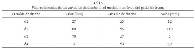 La parametrización del modelo geométrico del pedal de freno incluye un conjunto de ocho (8) variables de diseño (Figura 1) seleccionadas usando análisis de sensibilidad global [11] asegurando un razonable, costo computacional y error estimado durante la construcción de los metamodelos. Nótese que estas variables, cuyos límites aparecen reportados en la Tabla 1, permiten un número significativo de formas alternativas del pedal. Las Tablas 2 y 3 muestran los parámetros geométricos del modelo del pedal y las propiedades del material, respectivamente.
