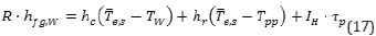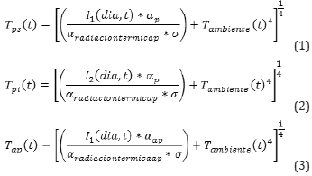 I1, I2, α, σ: Irradiación solar en superficie inclinada superior e inferior (W/m2), Absortividad (adimensional) y Constante de Stefan-Boltzman (W/m2K4), respectivamente.