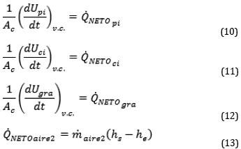 Para el volumen de control sobre policarbonato inferior (ec. 10), el cuerpo negro inferior (ec. 11), el almacenador térmico (ec. 12) y el aire en el ducto inferior (ec. 13):