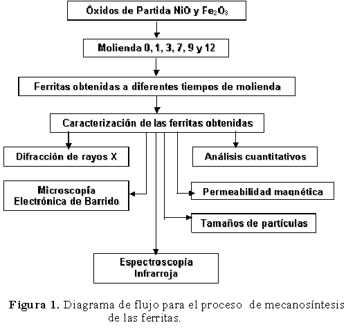 Se utilizaron como materiales de partida, óxidos de Fe3+ y Ni2+ grado reactivo y alta pureza (Aldrich). La mecanosíntesis se llevó a cabo en un molino Spex 8000D iniciando a temperatura ambiente, empleando como medio de molienda, esferas de acero al carbono de 13 mm de diámetro y frascos cilíndricos de este mismo material de 50 cm3 de capacidad [6] y siguiendo el procedimiento utilizado en trabajos reportados [7]. Se usó una relación en peso de bolas/polvos 10:1. El tiempo máximo del