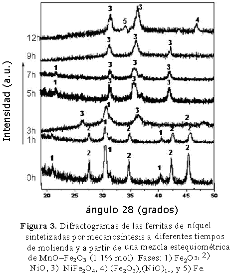 Puede observarse además, a partir de las 12 h, la presencia de la fase del Fe metálico (carta de difracción 6-696) [16], la cual aparece como consecuencia de los choques entre bolas o con el cuerpo del cilindro. Esta fase de Fe metálico, permaneció presente durante todo el proceso de molienda, incluso incrementó a mayores tiempos de 25, 35 y 50 horas (resultados no mostrados).