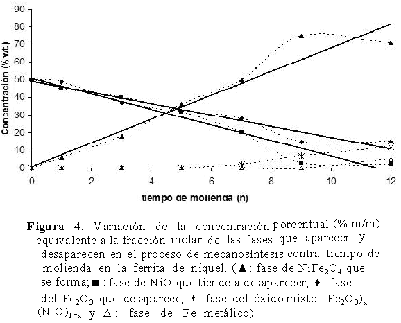 Las fracciones molares de las fases de polvo de los productos, obtenidos por cálculos a partir del análisis por el método de Rietveld y en función de los diferentes tiempos de molienda, indican que la fracción NiFe2O4 aumenta a expensas de que las fracciones del Fe2O3 y del NiO disminuyen, de manera parcial, en las etapas de molienda tempranas, alcanzando su valor máximo (78%), aproximadamente a las 9-10 h de proceso.