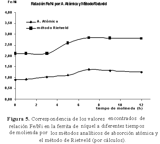 Al evaluar las relaciones Fe/Ni calculadas por el método Rietveld (MR) (Tabla 1) y compararlas con las encontradas a partir de los resultados de absorción atómica (AA), se puede apreciar en la Figura 5, la correlación entre los dos métodos. Se observa la correspondencia de la mayor relación Fe/Ni entre las 7-9 h de proceso y que esta relación disminuye muy poco a mayores tiempos de moliendas.