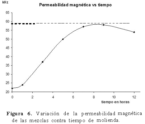 Las evaluaciones de la permeabilidad magnética de las ferritas de níquel que fueron obtenidas se observan en la Figura 6. Se aprecia una cierta permeabilidad magnética que inicia y se ve incrementada en la medida en que comienza la aparición de la fase espinela NiFe2O4 y justamente a las 9 h de molienda, alcanza su máximo (57,6 kHz) aunque mucho más baja que para una magnetita pura (96,0 kHz).