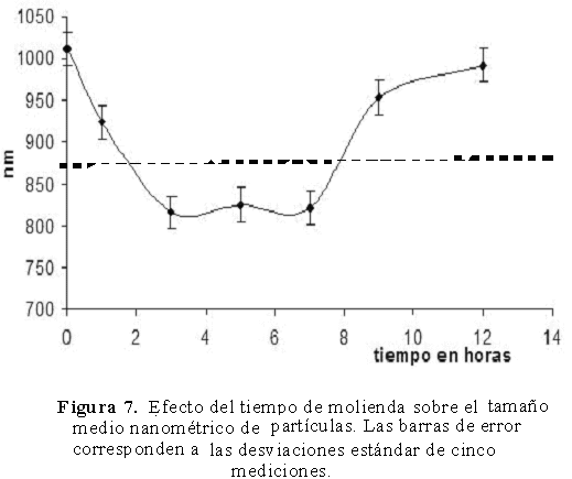 Los tamaños nanométricos de partículas en suspensiones coloidales de los polvos de ferritas de níquel en agua desionizada, arrojaron los resultados que se muestran en la Figura 7. El análisis permite corroborar una disminución del tamaño de las mismas, al incrementar el tiempo de molienda hasta llegar a un tamaño nanométrico promedio de 825 nm que se alcanza entre las 3 primeras horas de molienda y hasta las 7 horas del proceso. A partir de aquí y a mayores tiempos, se incrementa de nuevo el tamaño de partículas, lo cual está asociado a la aglomeración de las mismas.