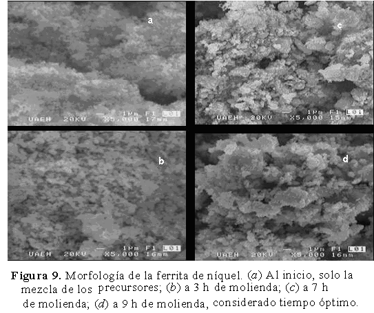 El análisis de las microfotografías que se observan en la Figura 9 permite comparar las morfologías conseguidas para las ferritas de níquel a diferentes tiempos de molienda.
