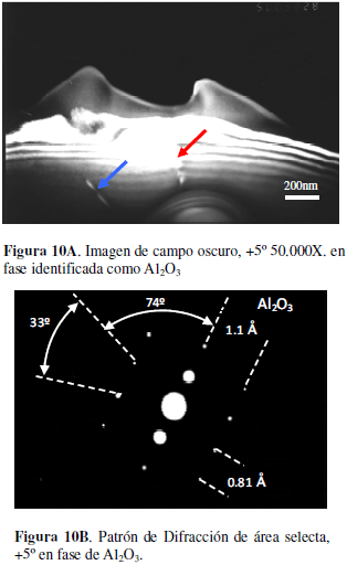 El análisis de la fase de refuerzo, es decir, la alúmina en exceso, evidenció la presencia de dislocaciones y maclas (Figuras 10 A-B), probablemente debido a la diferencia en la expansión térmica entre la matriz y el refuerzo, lo que se espera proporcione una mejora en la propiedades mecánicas, por el mecanismo de limitación del recorrido de la grieta.