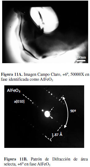 Con el fin de determinar el efecto estructural de la ilmenita pura, (determinada como el estabilizador más importante), se hizo un estudio completo por Microscopía Electrónica de Transmisión (MET) del material compuesto con exceso de alúmina (TAFPA). En las imágenes y patrones de difracción de electrones de las muestras sinterizadas de Al2O3 + TiO2 + FeTiO3 + exceso de Al2O3 (Fig. 9A-B), se pudo detectar Fe2O3, que corrobora lo encontrado anteriormente por Suresh et al, [36] que el FeTiO3 al ser calentado por debajo de 800ºC, en atmósfera oxidante se descompone según la reacción: