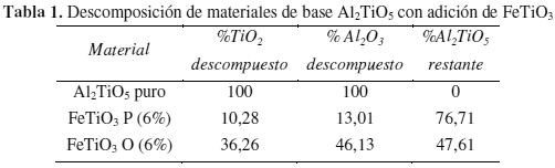 Brown et al [19] encontraron que adiciones de Fe2O3 se disuelven en la red cristalina del Al2TiO5 por formación del Fe2TiO5. Esto explicaría el beneficio de la FeTiO3 en la formación del Al2TiO5, de hecho en los análisis por DRX (figuras 2 y 3), no se encontró FeTiO3 libre, Fe2O3 ni Fe2TiO5, lo que hace presumir que toda la ilmenita después de descomponerse entra en solución en el titanato de aluminio formado.