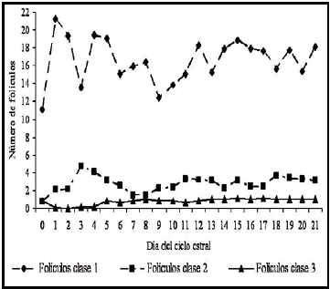 Durante una onda, los folículos cambian su diámetro en forma dinámica como consecuencia de su crecimiento, por lo que dejan una clase para ingresar en la siguiente (Lucy et al., 1991). En el presente estudio, se observaron cambios dinámicos en las clases foliculares (Figura 1), iniciándose el d 2 del CE una disminución en el número de folículos C1, al mismo tiempo que se registró un aumento en el número de folículos C2, hasta alcanzar su mayor número el día 3 del CE. Esto obedece al aumento en el tamaño de los folículos C1, los cuales dejan su clase de origen para ingresar en la C2. El día 9 se inicia una nueva disminución en el número de folículos C1, acompañado de un aumento en el número de folículos C2, registrándose el máximo número el d 11 del ciclo. Esto sugiere que el reclutamiento de la primera onda ocurre el d 2 del CE, mientras que el reclutamiento de la segunda onda se inicia el d 9 del ciclo. De igual forma, los d 4 y 12 del CE se observa una disminución en el número de folículos C2, seguido de un aumento en el número de folículos C3, asociado con la fase de selección folicular (Lucy et al., 1991). Esto indica que la selección del FD1 ocurrió el d 4 del CE, mientras que el FD2 fue seleccionado el d 12 del ciclo. Finalmente, el día 11 del ciclo, se registra una disminución en el número de folículos de C3, lo cual indica que el FD1 perdió su dominancia funcional, marcando el final de la primera onda de CF (Fortune, 1993), habiendo ocurrido la emergencia de una nueva onda el d 9 del CE.