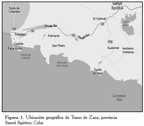El estudio fue realizado entre los años 2009 - 2011 en la empresa camaronera de Tunas de Zaza ubicada al sur de la provincia de Sancti Spiritus, República de Cuba, en las coordenadas geográficas de 21o 3803 N y 79o 3311 W (Figura 1), situada en los márgenes del Río Zaza, a 8 km del poblado de Tunas de Zaza.