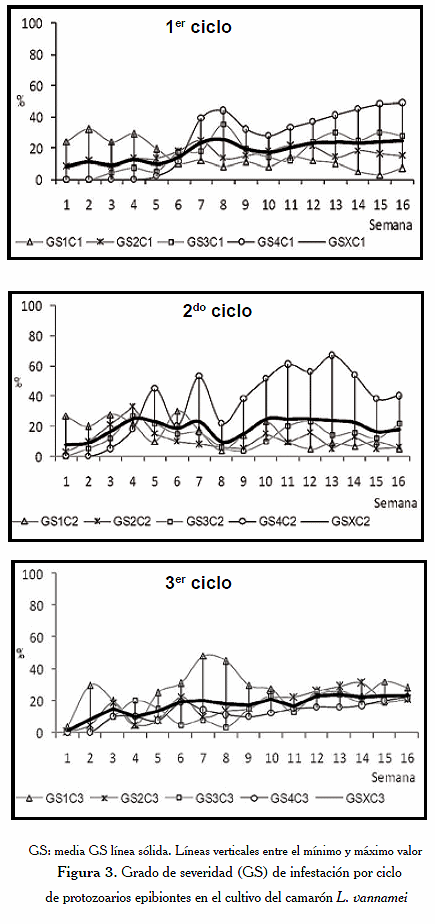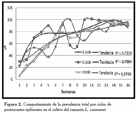 Los resultados de los ciclos 1 y 2 difieren además de los obtenidos por López et al. (2010) en granjas camaroneras de México, quienes revelaron que la presencia de Epistylis sp., Zoothamnium sp. y Acineta sp., no fue alarmante en los camarones cultivados y se asemejan a los obtenidos en el ciclo 3, a excepción de Epistylis sp., que alcanza alta prevalencia en todos los ciclos.