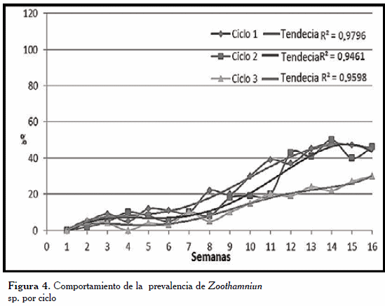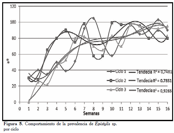 Por su parte, la presencia de Epistylis sp. fue elevada desde las primeras semanas en los tres ciclos (Figura 5), siendo más marcada en el segundo ciclo con alzas y picos elevados a partir de la tercera semana.