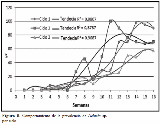 La presencia de Acineta sp. fue muy discreta durante las primeras semanas. Hacia la mitad del cultivo presentó una tendencia curvilínea en ascenso en los dos primeros ciclos, con valores máximos y un ligero descenso hacia las últimas semanas. Para el tercer ciclo, la tendencia fue más discreta con menor pendiente, sus mayores registros se observaron hacia el final del cultivo (Figura 6).