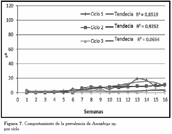 El comportamiento de Ascophrys sp. fue prácticamente ausente durante las primeras cinco semanas para los tres ciclos. A partir de las semanas 7 y 8, se presentó con tendencia curvilínea discreta, más marcada en el 2do ciclo, a diferencia del 3ro en el que estuvo casi ausente, sin tendencia perceptible (Figura 7).