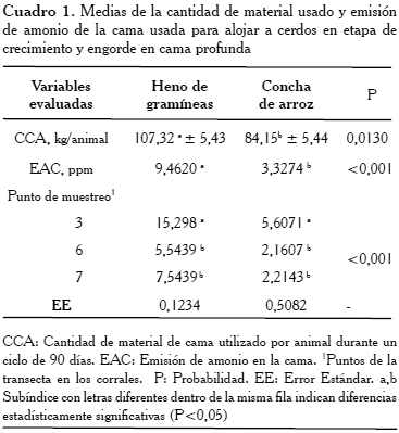 En el Cuadro1, se muestra la cantidad de material de cama requerido por animal en sistema de cama profunda, siendo el gasto del HG mayor (P<0,05) (+23,163 kg/cerdo) sobre la CA. No obstante, los valores de cantidad de cama usada por animal por ciclo son superiores a los reportados por Brumm et al. [12] y Honeyman et al. [13], quienes al comparar varios materiales de cama encontraron necesidades de 45 a 50 kg de cama/cerdo/ciclo para pajas y rastrojos de gramíneas en periodo seco y 100 kg de cama/cerdo/ciclo para el periodo invernal.