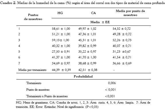 Así mismo, se observó mayor porcentaje de HC con HG (1,88%), respecto a la CA (Cuadro 2). Sin embargo, es importante señalar que tanto para la variable HC como para la EAC, los resultados son afectados entre otras cosas, por la constante incorporación de material de cama necesario para el buen manejo del sistema, por lo cual es posible que estas diferencias sean mucho mayores a las detectadas, debido a las características físicas de los materiales de cama usados. Se observó que la CA presentó una mayor capacidad de infiltración de orina y alta aireación, debido probablemente a que el tamaño y peso del material facilita el movimiento de la cama por parte de los cerdos, provocando que las condiciones del microclima generadas, sean menos favorables para los procesos fermentativos y la prevalencia de parásitos y otros patógenos [3].