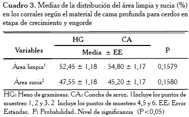 Además, Dimeglio [17] reporta que una cama en un estado de uso óptimo, presenta un 25 % del área húmeda o de defecación, un 15 % de área blanda o de transición y un 60 % de área seca. En este ensayo, las proporciones óptimas del área sucia comparadas con el área limpia, fueron similares a lo planteado anteriormente solo hasta las semanas 8 y 10. Esto se atribuye a que a medida que los animales crecieron, la cantidad de desechos sobre la cama aumentó, promoviendo un crecimiento del área sucia en los corrales y a partir de estas semanas la incorporación de material adicional ya no era suficiente para contrarrestar el efecto de la alta deposición de heces y orina en la cama. Sin embargo, solo se reportan los promedios generales de área limpia y sucia por tratamiento (Cuadro 3), debido a que no fue posible comparar los resultados por semana de evaluación sin incurrir en error, ya que la incorporación continua de material de cama durante el periodo de crianza de los cerdos tuvo un impacto directo sobre la distribución del área limpia y sucia en el corral.