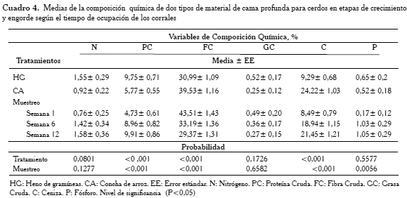 Tal como se esperaba, la composición química de la cama cambió debido a la deposición de restos de alimento, orina y excretas de los cerdos, lo cual se evidencia para HG y CA (Cuadro 4) en la ganancia para las fracciones de N (0,82 %), PC (5,18), C (12,96%) y P (0,88%) para ambos tratamientos al comparar los valores al inicio y final del ensayo; además, el microclima formado internamente en la cama promueve un continuo compostaje de la misma, lo cual ocasiona que disminuyan las fracciones fermentables, tales como la FC (-14,14%) y GC (-0,22%), respectivamente.
