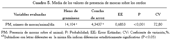 En este sentido, la presencia de moscas en los sistemas de producción con cerdos es uno de los problemas sanitarios de gran preocupación en cuanto a salud pública. Por tal razón, en este estudio se evaluó la presencia de moscas sobre los animales, con el fin de estimar si realmente existen diferencias según el material de cama usado, encontrando que fue mayor en HG respecto a la CA (Cuadro 5), lo que indica que el HG como material de cama favorece la reproducción y permanencia de estos ectoparásitos en 9,76 moscas/animal/d (P<0,001), comparado con la CA. Estos resultados posiblemente se deben las diferencias de humedad de la cama, pues las moscas requieren alta humedad en los sustratos que usan para el desarrollo de su estadio larval.