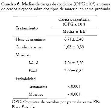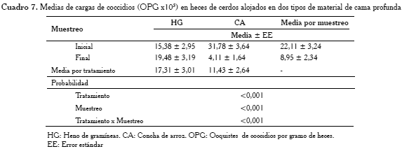 Las cargas de endoparásitos encontradas solo incluían protozoarios del grupo de los coccidios, para heces y cama de los cerdos. Los resultados indican que hubo diferencias para el promedio de la carga de coccidias en cama y muestreo entre tratamientos (Cuadro 6), mostrando superioridad en 7,09 x 103 OPG para HG respecto a la CA. En general se observó una reducción de 5,04 x 103 entre el muestreo final e inicial para ambos tratamientos. Sin embargo, al analizar la interacción tratamiento x muestreo, no se produjeron diferencias estadísticamente significativas. Entre las posibles causas que promueven la reducción de coccidias en la cama se destaca la dinámica establecida entre los cerdos y el material de cama, a través de la remoción de material fecal de las capas superficiales hacia capas más profundas de la misma.