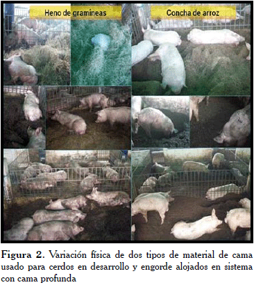 La concha de arroz presentó características de humedad, emisión de amonio, zonificación de áreas de uso por los animales, presencia de ectoparásitos en la cama y animales más favorables para el bienestar de los cerdos que el heno de gramíneas. Además se requirió menor cantidad de material de cama por animal por ciclo productivo en concha de arroz comparado con heno de gramíneas. La carga de coccidias en heces fue mayor en cerdos alojados en cama de heno de gramíneas respecto a los criados en concha de arroz; sin embargo, las coccidias no representan un problema parasitario para cerdos en crecimiento y engorde.