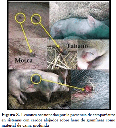 Estos resultados coinciden con los obtenidos por Cruz et al. [3] quienes estudiaron los sistemas de cama profunda (con HG como cama) comparado con el sistema convencional con piso de rejilla, reportando valores de 52 y 80 moscas/animal/d, respectivamente; siendo los valores observados menores a los reportados por dichos autores. Asimismo, se presentaron lesiones o miasis causadas por la presencia de moscas asociadas con otros insectos de la familia Tabanidae, afectando a un 4,35% de los cerdos criados sobre HG como material de cama (Figura 3), influyendo negativamente en el bienestar de los mismos, mientras que en CA, no se presentó ningún caso. Philippe et al. [14] resaltan que existe una menor presencia de ectoparásitos en los SCP respecto a los sistemas convencionales, contribuyendo con el bienestar animal.