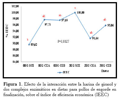 Figura 1. Efecto de la interacción entre la harina de girasol y dos complejos enzimáticos en dietas para pollos de engorde en finalización, sobre el índice de eficiencia económica (IEEC)