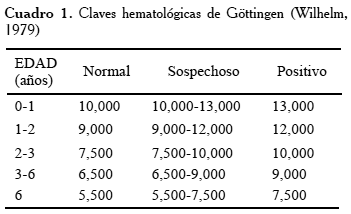 Para el análisis hematológico se realizaron tres cuadros hemáticos por ejemplar a intervalos de dos meses y se realizó un recuento manual de leucocitos por triplicado, para cada muestra; a los resultados se les aplicaron las claves hematológicas de Göttingen (Cuadro 1).