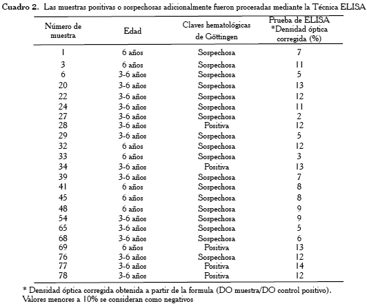Las claves de Göttingen permitieron evidenciar que, de las 81 muestras, cinco fueron positivas y 18 sospechosas. Estas 23 muestras fueron procesadas mediante la técnica de ELISA [15]; las cinco muestras positivas con las claves de Göttingen resultaron también positivas a la técnica de ELISA y seis de las muestras sospechosas resultaron positivas (Cuadro 2).