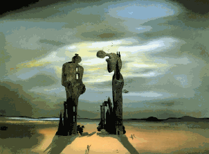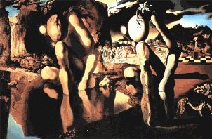 España (1938). Imágenes dobles. El horror y la angustia de la guerra. El horror que despertaba la guerra y la revolución, situaciones en que su patria se hallaba desgraciadamente sumergida constituyó una fuente atormentada de inspiración para este cuadro de Dalí. En esta pintura, la España desgarrada está representada por una figura de mujer que descansa sobre una mesa de noche. La cabeza y el torso de la figura femenina forman parte al mismo tiempo de una doble imagen, donde se plasman grupos entregados a violentos combates. Además, en el pecho y en el abdomen superior se encuentra una pareja de picadores enfrentados, que dirigen sus lanzas el uno contra el otro e introducen en la composición un elemento hispánico el cual parece haberse inspirado en el combate de los "Condottieri de Leonardo" (Adoración de los Magos, Galería de los Uffizi, Florencia).