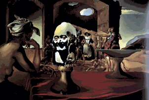 El mercado de esclavos y el busto de Voltaire que desaparece (1940). Dalí pinto dos versiones sobre este tema, la primera realizada en Francia (1940) antes de la partida de Dalí para Nueva York y la segunda en Estados Unidos de Norte América. En ambas pinturas las fuerzas alucinatorias les da curso Dalí mediante el recurso de las imágenes dobles. El elemento central lo constituye la cabeza del busto de Voltaire el celebre filósofo francés (del escultor Houdon) cuya cara está formada por los cuerpos de dos mujeres ataviadas con las vestimentas propias de la época del siglo XVII, cuyas cabezas y adornos conforman los ojos y la barbilla del famoso escritor y filósofo.