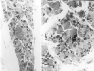 Figura 1. (A) Fascículo muscular con atrofia neurogénica y acúmulos de nemalines intermiofibrilares (flecha), H&E x250. (B) Fascículo muscular con atrofia sistematizada de fibras y acúmulos de nemalines (flecha), H&E x250.