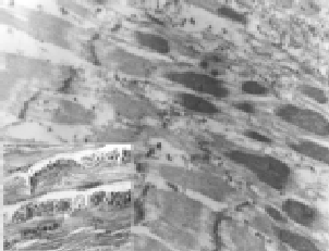 Figura 2. (A) Fibra muscular con acúmulos de "nemalines subsarcolemales" (flechas), H&E x400. (B) Microfotografía electrónica de fibra muscular con nemalines (flechas), algunos cercanos a bandas Z, x10.000.