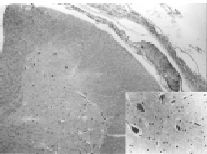 Figura 3. (A) Neuronas del asta anterior de la médula espinal (corte transversal) en número normal, algunas con degeneración simple (recuadro), H&E, x25. (B) Detalle de las neuronas del asta anterior con degeneración simple (flechas), H&E, x250.
