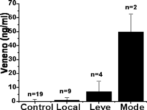 La Figura 1 muestra las medianas e intervalos de confianza al 95 % de la venenemia de pacientes con sintomatología local, leve y moderada, así como los valores del grupo control que representan la sensibilidad del método. La concentración de veneno en plasma fue de: 1 (0 2,7) ng/mL; 7,3 (2,7 14,6) ng/mL y 50 (37,4 62,6) ng/mL en los pacientes que desarrollaron sintomatología local, sintomatología sistémica leve y sintomatología sistémica moderada respectivamente. El grupo control presentó valores de 0,02 (0 3,88) ng/mL.