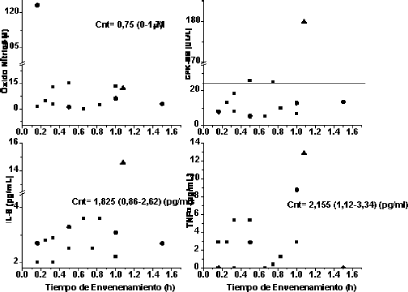 La Figura 3 muestra los valores plasmáticos de NO, TNF-a, IL-6 y CPK-MB que presentaron los pacientes de escorpionismo en función del tiempo de emponzoñamiento. Los valores del grupo control se indican como la mediana con intervalo de confianza del 95 %. Los valores de referencia para el CPK-MB están representados en el gráfico entre las dos líneas paralelas. Encontramos que un gran número de pacientes presentaron niveles de óxido nítrico con un factor de 10 por encima de los niveles del grupo control [Cnt= 0,75 (0 - 1,7) µM]. Se observó en 1 paciente con sintomatología leve hasta 76 veces más NO que los controles. En la gráfica referente a las concentraciones plasmáticas de TNF-a encontramos que este aumentó en 2 pacientes con sintomatología local, 1 paciente con sintomatología leve y en 1 paciente con sintomatología moderada. El nivel plasmático de TNF-a aumentó en proporción al grado de severidad del cuadro clínico, encontrando valores hasta 4 veces (12,9 pg/mL) respecto al grupo control, [Cnt= 2,15 (1,1-3,3) pg/mL]. En la gráfica de las concentraciones plasmáticas de IL-6 observamos que ésta se incrementó en los pacientes con sintomatología leve y moderada. El aumento es proporcional al grado de severidad del cuadro clínico, encontrando valores hasta 6 veces respecto del grupo control. En la gráfica referente a las concentraciones de CPK-MB, se observa que en los 2 pacientes que presentaron emponzoñamiento sistémico moderado esta estaba por encima de los valores normales antes de 2 horas luego del accidente. En los pacientes que presentaron emponzoñamientos locales o sistémicos leves la CPK-MB se ubicó dentro de los valores referencia (0-24 UI/L representado en el gráfico entre las dos líneas paralelas).