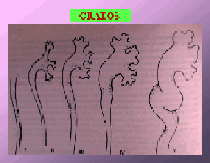 Figura 3. Clasificación internacional del reflujo. Grado I: no alcanza al riñón. II Llega al riñón, no hay dilatación ni tortuosidad. III Hay dilatación del uréter sin lesión papilar. IV Dilatación y aplanamiento de los cálices. V Severa dilatación y tortuosidad del uréter y cálices que están invertidos.