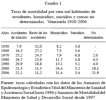 De las cifras del Cuadro 1, con las tasas de mortalidad por causas externas en Venezuela, entre 1950 y 2006, observamos que la de homicidios es la más alta de todas.