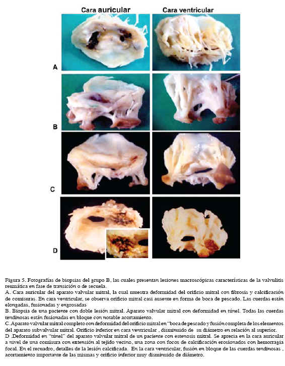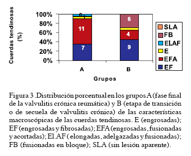 En ambos grupos, la mayoría de las cuerdas tendinosas (98,0 %), estaban engrosadas y fusionadas. Un solo caso del grupo A, presentó cuerdas tendinosas de aspecto macroscópico aparentemente normal. En cinco casos de ambos grupos se observó deformidad en túnel, debido a fusión de todas las cuerdas tendinosas por fibrosis. En estas piezas los dos orificios midieron: el superior de 2,4 cm en diámetro mayor (extremos: 2-2,8) y el inferior de 1,1 cm. (extremos: 1,1-1,3) en el grupo A, y 2,3 cm. (extremos: 3-1,1) y 1,2 cm (extremos 2-1) en el grupo B. En los dos grupos, varios pacientes presentaron toque de las válvulas aórticas por el proceso inflamatorio reumático.