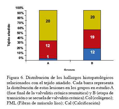 El estudio histológico de ambos grupos, mostró tejido añadido en las valvas de todos los casos, formado por tejido colágeno, infiltrado inflamatorio predominantemente linfomononuclear sin presencia de granulomas o nódulos de Aschoff, y fibras musculares lisas (Figura 6). En ambos grupos predominó el grado 1 de inflamación (81,6 %). Los mayores grados de inflamación fueron observados en el grupo A (Figura 7a). La fibrosis estuvo presente en todos los casos. En los pacientes entre 21 y 40 años predominó la fibrosis de grado 3 (80 %) y en los pacientes mayores, este grado fue exclusivo.