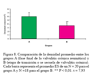 La presencia de vasos sanguíneos neoformados y de células endoteliales aisladas inmunomarcadas con CD34, fue un hallazgo constante en las valvas, excepto en dos casos del grupo B. Figura 9. La correlación entre los grupos evolutivos de la valvulitis reumática y la angiogénesis, demostró que la densidad de la neovascularización fue decreciente desde el grupo A al B. En el grupo A, la densidad fue de 5,98 ±1,08 vasos/mm2 y en el grupo B, de 3,55±0,76 vasos/ mm2) y fue significativamente menor (P < 0,01. t = 7,93) y aún más que en los casos de la fase inicial de la valvulitis crónica (14,78 ± 1,92), previamente reportados por nosotros (11). Figura 9.