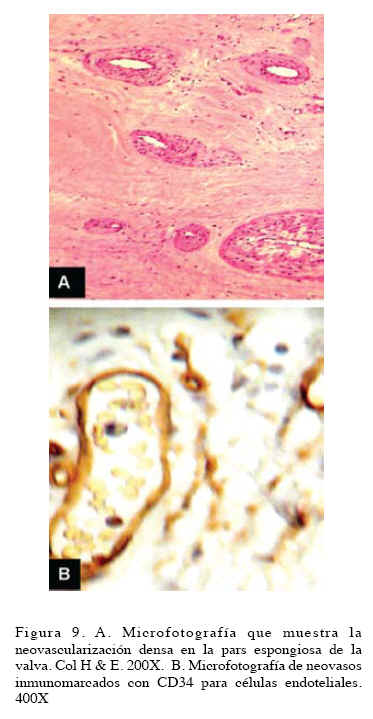 Durante toda su evolución, el tejido valvular presenta alteraciones en su estructura, especialmente en la matriz extracelular de la capa espongiosa de la valva, donde se evidencia infiltrado inflamatorio, fibrosis, aumento de mucopolisacáridos ácidos y neovascularización o angiogénesis, propios del tejido de reparación o granulación, siendo variable el grado de estas alteraciones en cada etapa de su evolución (6,7).
