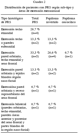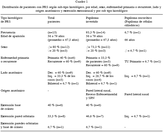 La distribución de pacientes según sub-tipo histológico de PRS, por edad, sexo, enfermedad primaria o recurrente, lado y origen anatómicos y extensión extra-nasosinusal y por sub tipo histológico se tabularon (Tabla 1), determinando que el 93,3 % (n=14) de los pacientes tratados en este estudio presentaron diagnósticos con histopatología consistente de Papiloma Invertido (PI) y 6,7 % (n=1) de los casos presento histología de papiloma oncocítico (PO).
