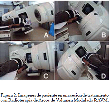 En los casos donde se aplicó RAVM, se eligieron 4 arcos parciales de aplicación de radiación (dos axiales y dos sagitales). Luego de elegir los ángulos de inicio y finalización de cada arco, se procedió a la planificación inversa, la cual posee los mismos criterios aplicados en la RTIM. Esta tecnología combina las ventajas de la RTIM con las de arco terapia, obteniéndose una altísima calidad de tratamiento en un tiempo sumamente corto (aproximadamente 3 minutos) para de esta manera aumentar la comodidad del paciente y los niveles de precisión del tratamiento. (Figura 2).
