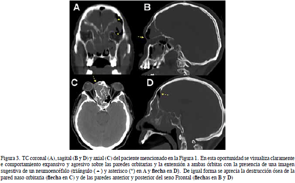El 53,3 % (n=8) de los pacientes presentaron estudios de imágenes con signos de erosión y/o destrucción ósea radiológica que afectaban la pared orbitaria. En 40 % (n=6) de los casos los signos de afectación ósea involucraban la base craneal y en 6,7 % (n=1) se identificó que el compromiso óseo era bilateral, afectando las paredes orbitaria, la base del cráneo y partes blandas de la región naso-facial.