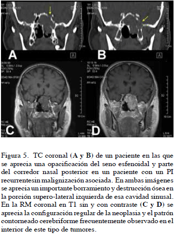 En 1 paciente (6,7 %) la neoplasia etmoidal avanzó hacia el seno frontal y el receso supra-orbitario y en otro paciente (6,7 %) con enfermedad tumoral recurrente la neoplásica fue bilateral, afectando todos los SPN, con extensión intra-orbitaria, intra-craneal y a partes blandas de la región naso-facial. (Figuras 3 y 4). A pesar del comportamiento altamente agresivo en estos dos últimos casos, el estudio histopatológico completo de los especímenes tumorales, fueron concordantes con PIs sin malignización asociada.
